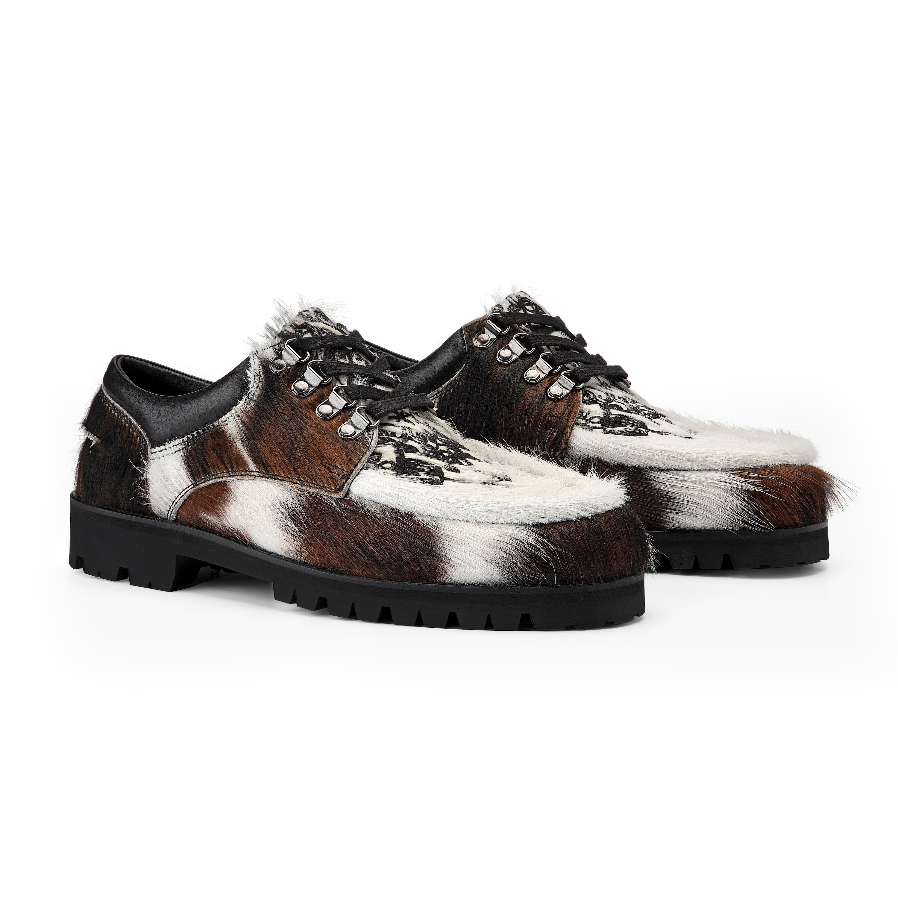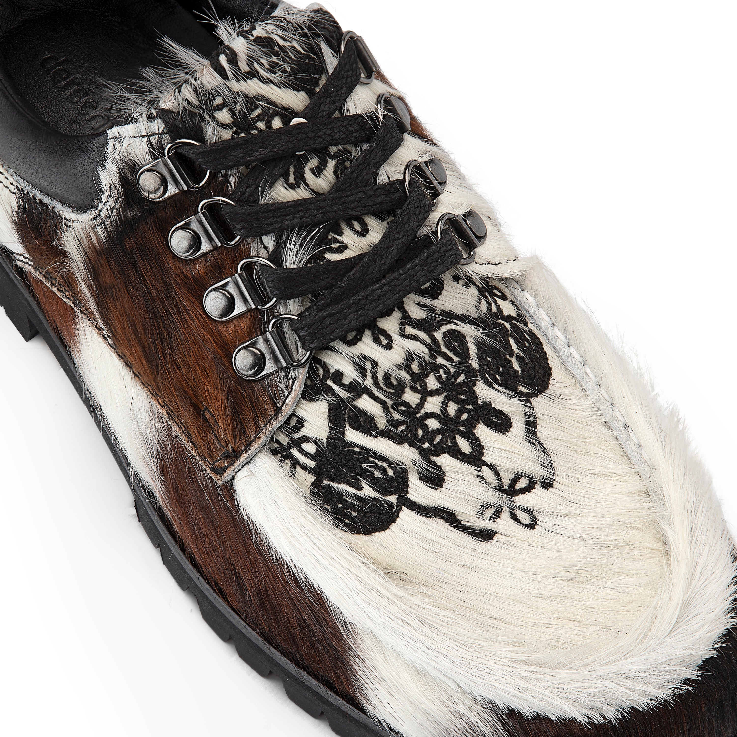 REAL COWHIDE MAY PATTERN WILL VARY WITH EACH SHOE / cow hide genuine leather / leather inner-lining / embossed insole / embroidery on tongue / rubber sole / fits true to size / manufactured in Türkiye