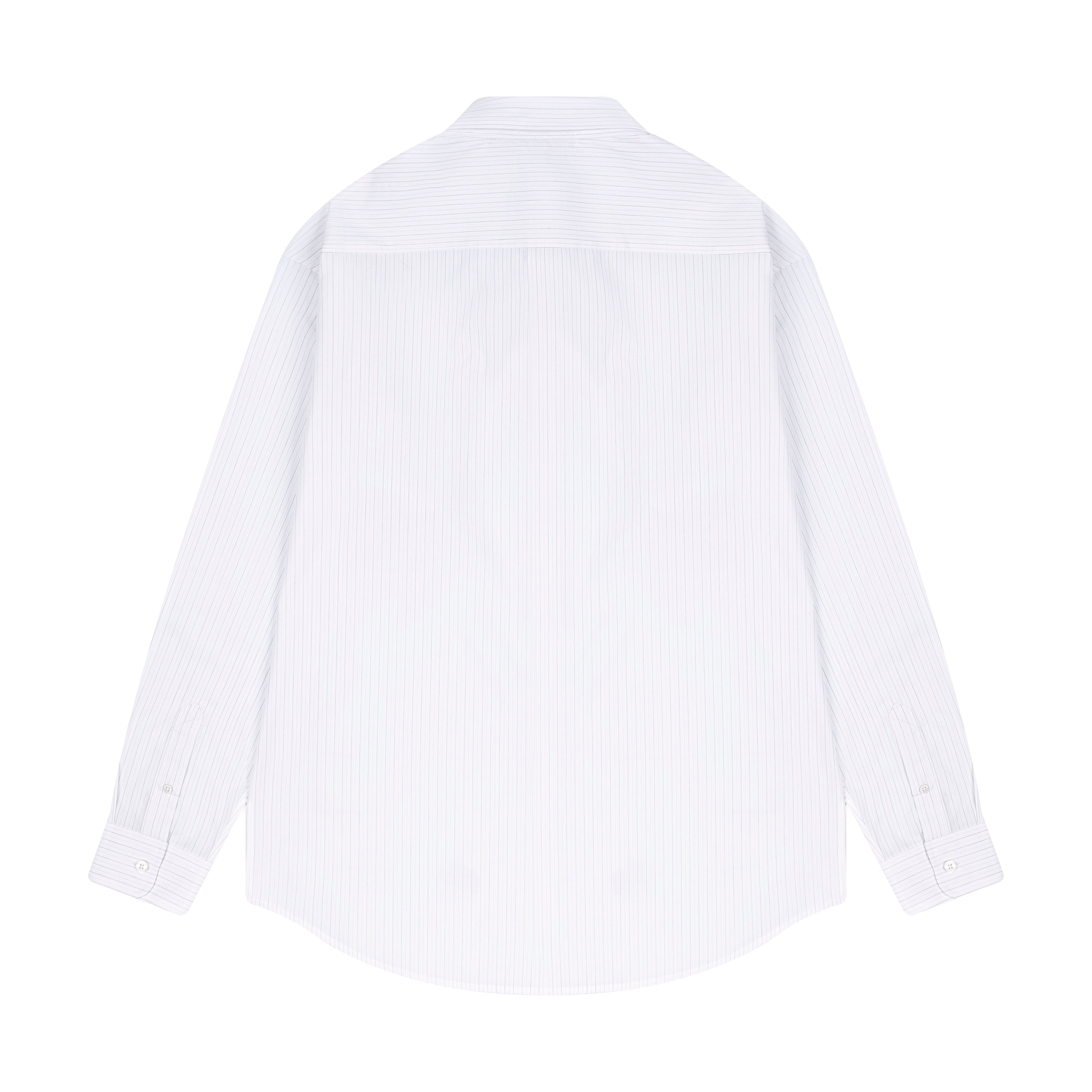 100% cotton / white-grey striped / embroidery on front / custom buttons / curved hem / relaxed fit / fits true to size