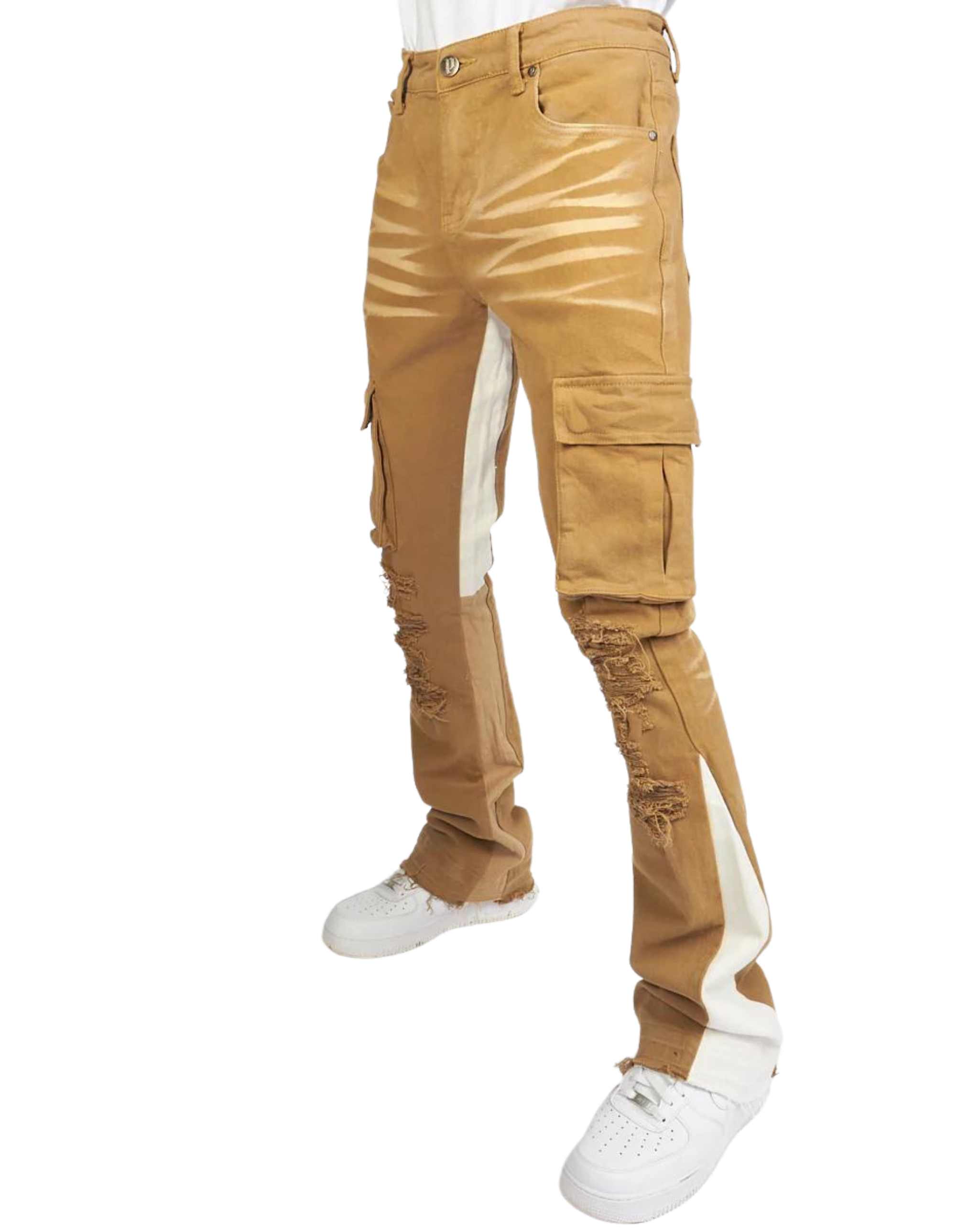 This pair of jeans is made of 98% cotton and 2% spandex, offering a comfortable and stretchy fit. The model wearing the jeans is 6' tall wearing a size 32. The cotton material is durable and breathable, while the spandex adds a hint of stretch for ease of movement. The stacked denim design provides a modern, on-trend look, making these jeans a versatile addition to any wardrobe. Perfect for casual wear or dressing up for a night out, these jeans are sure to become a staple in your wardrobe.
